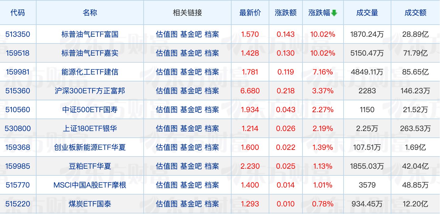 具体来看,标普油气ETF富国、标普油气ETF嘉实涨停。